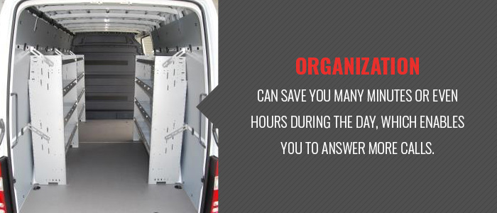 When you arrive to do a job, you need to already be thinking about the next one. An organized van means you will spend less time searching for tools or going back and forth between the job site and your van to find what you need. Organization can save you many minutes or even hours during the day, which enables you to answer more calls.